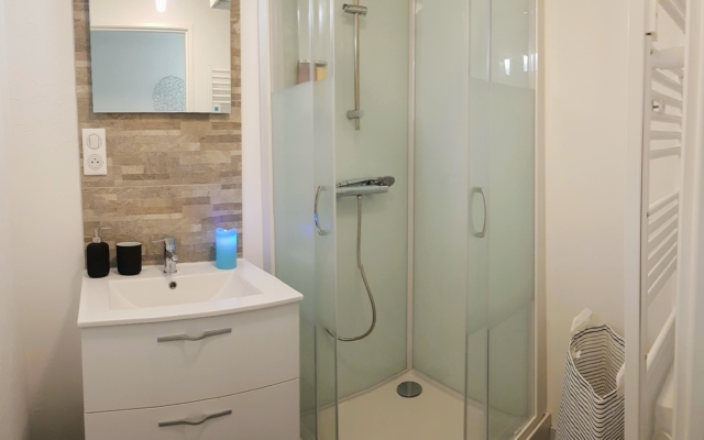 De même prenez plaisir à vous attarder dans la belle salle d’eau avec douche et meuble vasque.