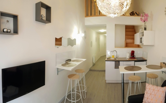 Situé au troisième étage (sans ascenseur) de notre Appart’hôtel du coté rue, ce logement est un T2 duplex de 30 m² avec une configuration idéale pour accueillir jusqu’à 4 personnes.